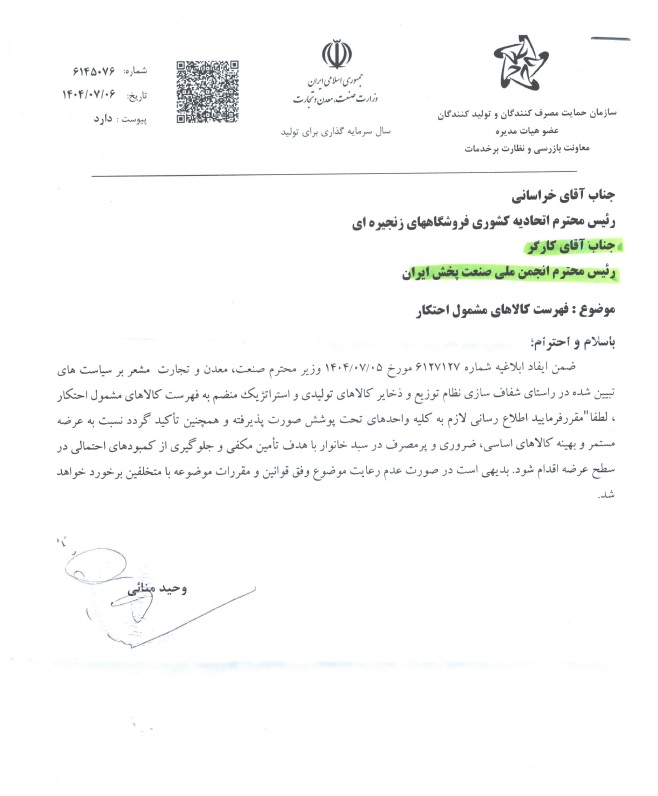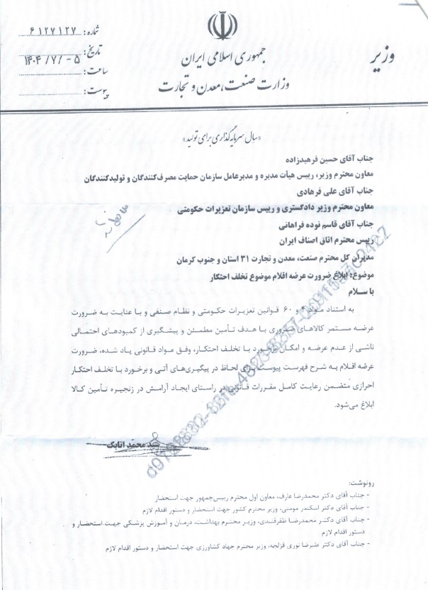 به گزارش روابط عمومی، وزیر صمت در نامه ای لیست کامل کالاهای مشمول احتکار را اعلام کرد.