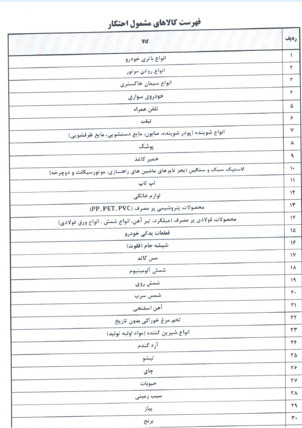 لیست کالاهای مشمول احتکار اعلام شد.