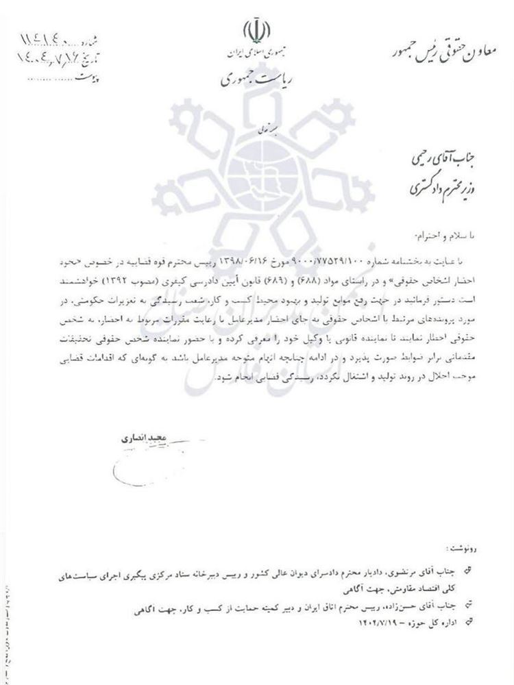 معاون حقوقی رئیس جمهور طی نامه ای به منظور رفع موانع تولید و بهبود محیط کسب و کار اعلام کرد در پرونده های مرتبط با اشخاص حقوقی الزامی برای احضار مدیرعامل وجود نخواهد داشت.
