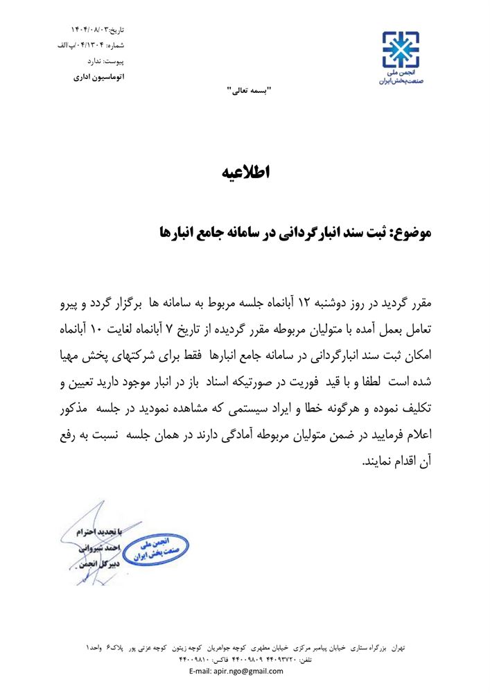 باتوجه به برگزاری جلسه ی سامانهها در روز دوشنبه ۱۲ آبان و نظر به تعامل با متولیان مربوطه، امکان ثبت سند انبارگردانی در سامانه جامع انبارها «فقط برای شرکتهای پخش» مهیا شده است.