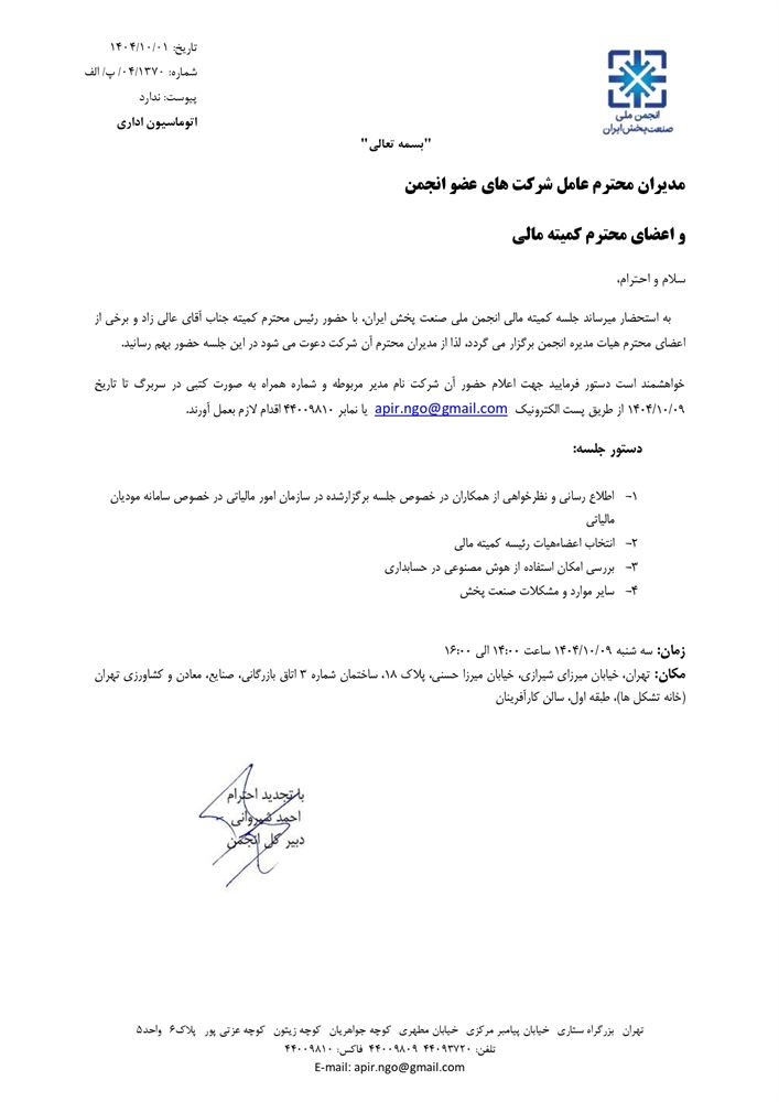 مدیریت این جلسه با «دکتر عالیزاد» رئیس کمیته ی مالی انجمن ملی صنعت پخش خواهد بود.