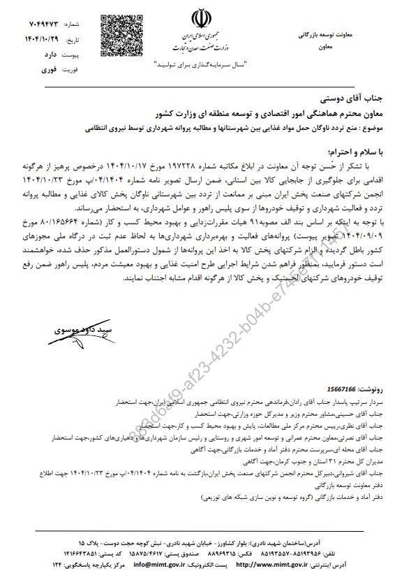 به گزارش روابط عمومی انجمن ملی صنعت پخش ایران، آقای موسوی معاون توسعه بازرگانی وزارت صنعت، معدن و تجارت در نامه ای خطاب به آقای دوستی معاون هماهنگی امور اقتصادی و توسعه منطقه ای وزارت کشور بار دیگر با ذکر مصوبه هیات مقررات زدایی و بهبود محیط کسب و کار، درخواست کرد باتوجه به عدم الزام شرکت های پخش کالا به اخذ پروانه بهره برداری شهرداری، دستور لازم جهت رفع توفیف خودروهای شرکت های پخش و جلوگیری از اقدامات مشابه صادر شود.